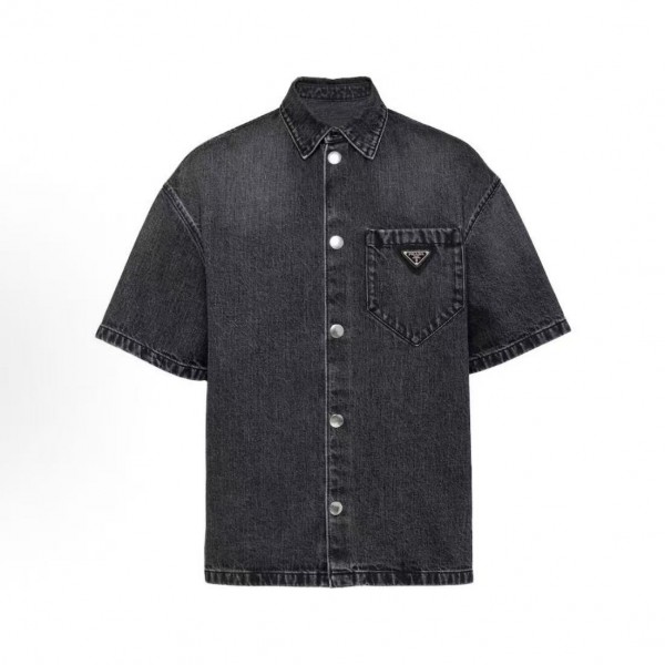 프라다 단색 로고 데님 루즈핏 반팔 셔츠 (X공장)