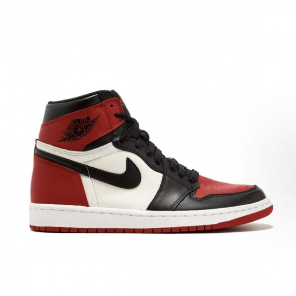 화이트 가죽 베이스 위에 블랙 오버레이, 그리고 강렬한 레드 컬러의 토박스와 힐, 아웃솔이 조화를 이루며 전통적인 조던 1의 아이덴티티를 그대로 보여줍니다.