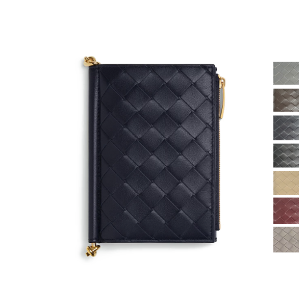 보테가베네타 솔스티스 미디엄 바이폴드 지갑입니다. 짙은 네이비 색감과 골드 톤 디테일이 조화를 이룹니다. 앞면은 인트레치아토 디테일, 뒷면은 매끈한 가죽입니다. 카드 슬롯과 지폐 수납공간이 실용적으로 구성되었습니다. 지갑과 파우치 역할을 겸해 데일리 사용에 적합합니다. 소재는 가죽으로 확인되며 세부 소재는 정보 확인 중입니다. #보테가베네타 #솔스티스지갑 #중지갑 #여성지갑 #가죽지갑