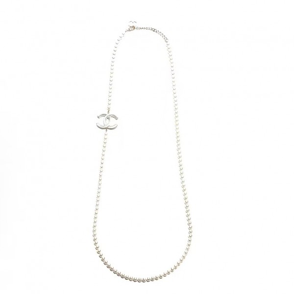 샤넬을 대표하는 CC 로고를 중심으로 디자인된 이 목걸이는 깔끔하고 세련된 라인을 강조하며, 화이트 컬러의 진주 장식이 더해져 우아하고 여성스러운 분위기를 완성합니다.
