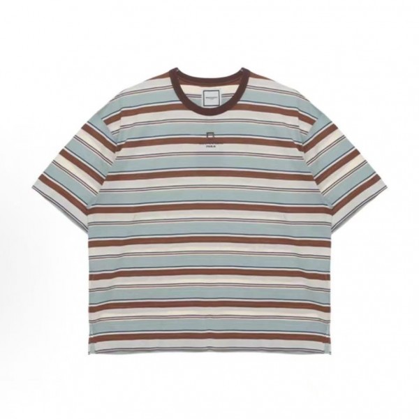 우영미 SS25 스트라이프 컴포트 미니멀 라운드넥 반소매 티셔츠 남성용 멀티컬러