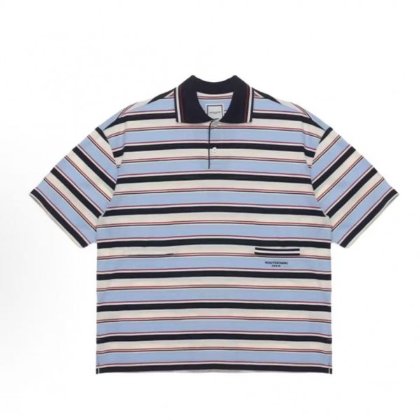 • 뒤로 우영미 SS25 스트라이프 심플 반팔 티셔츠 남성용 블루 > 남성의류