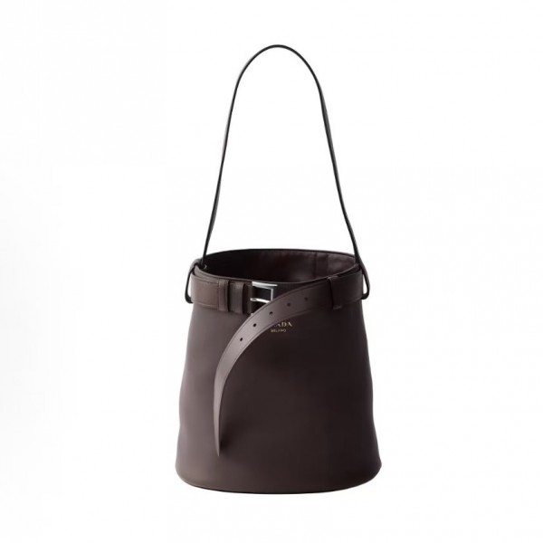 이 제품은 이탈리아 럭셔리 브랜드 Prada의 Buckle 라인 레더 버킷 숄더백 1BE085 모델입니다.