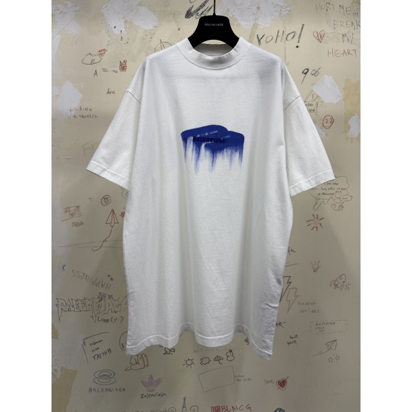 • 뒤로 발렌시아가 드립 로고 프린트 반팔 티셔츠 남녀공용 오버핏 화이트 > 남성의류