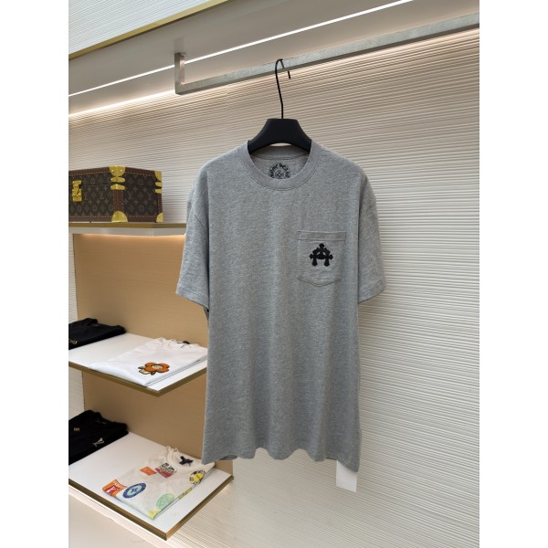 크롬하츠 꽃 패턴 대나무결 코튼 + 가죽 패치 반팔 티셔츠